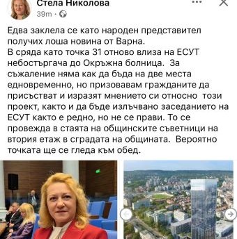 Стела Николова от ППДБ отново се била притеснила за небостъргача, защото явно за колите в Морската и за незаконните обекти на Коцев в Морската са й забранили да говори.