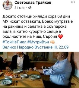 Снимка на Бойко Борисов как уж си пийва във вила в околностите на Ниш бе публикувана на стената във фейсбук на пишман протестъра Светослав Трайков. Той е бивш кадър на ГЕРБ във Варна, преобразил се в протестър, прилепил се първо към Бареков, после към Мая Манолова. Същият първо бе уволнен поради некадърност от Областна администрация – Варна, после изгонен и от партията заради изключително вулгарния език, който използва в социалните мрежи.