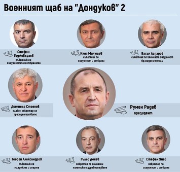 Нито един от кръговете на “Дондуков” 2 обаче не успя да се превърне в мозъчен тръст, който да е истински полезен на Румен Радев. Вместо това там има истински военен щаб. 7 са военните в екипа на президента – генерал от ВВС.