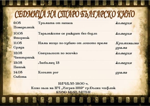 Община Долни чифлик, съвместно с НЧ Изгрев-1919 организират Седмица на старото българско кино. Жителите на общината ще могат да видят филмите Козият рог, Любимец 13 и др. Входът е безплатен.