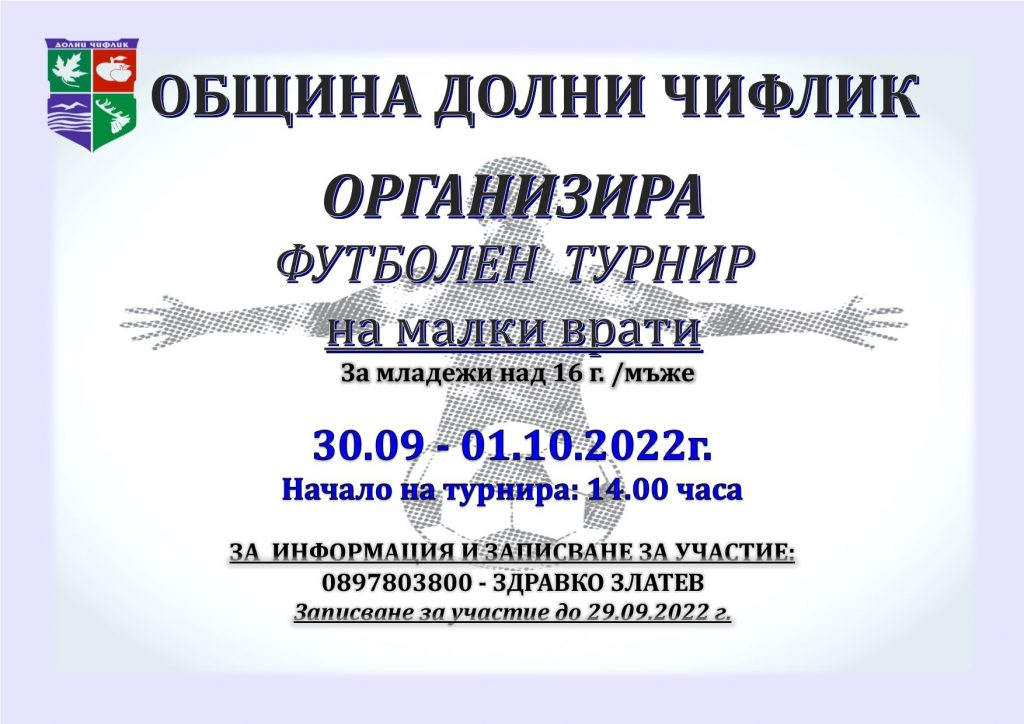 Община Долни чифлик организира футболен турнир за младежи и мъже над 16 г. на малки врати.Записването е до 29.09. при Златко Златев – тел.0897803800. Турнирът ще се проведе на 30.09-1.10. Начало на турнира – 14 ч. на 30.09.