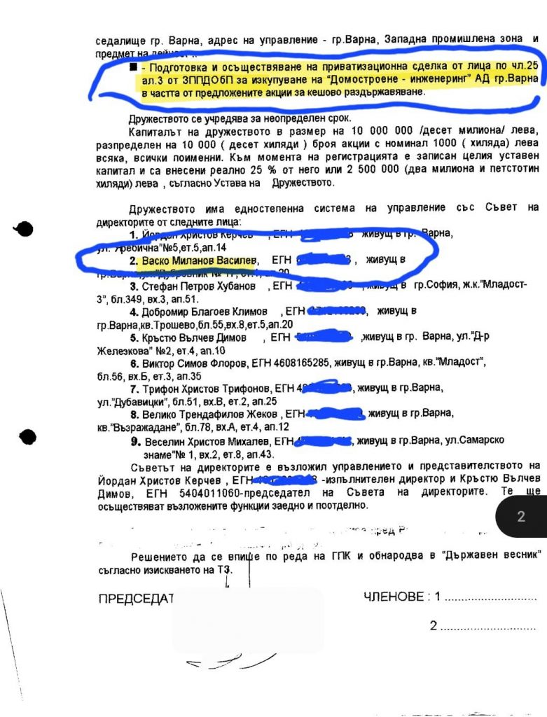 Реших да се поровя малко в Търговския регистър и регистъра за приватизация и какво да видя – в края на 1999 г. и началото на 2000 г. Домостроене Инженеринг – 2000 АД, в което Василев е учредител и акционер до ден днешен (както и от време на време член на Съвета на директорите) има за предмет на дейност осъществяване на приватизацията на Домостроителния комбинат на Варна – едно от значимите и стратегически държавни предприятия в града!