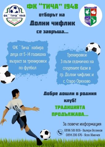 Отборът на ФК „Тича“ – Долни чифлик се завръща и набира деца от 5 до 14 годишна възраст за тренировки.