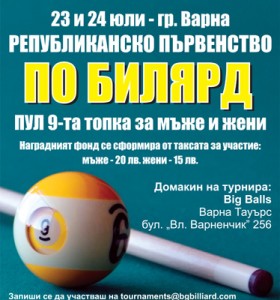 На 23 и 24 юли гр. Варна ще бъде домакин на кръг от републиканско първенство по билярд (ПУЛ 9-та топка) за жени и мъже. Турнирът ще се проведе на 8 маси във варненския клуб по билярд – Big Balls (Варна Тауърс, бул. „Вл. Варненчик” 256). Наградният фонд ще бъде сформиран от таксата за участие, която е 20 лв. за мъже и 15 лв. за жени. Записването се извършва до 21 юли на tournaments@bgbilliard.com или на място в билярд клуб Big Balls.Жребият ще се тегли на 23 юли, преди започването на турнира. Водачите и под водачите, ще бъдат поставени на база първи и втори кръг от ранг листата на 9-та топка за 2011г.Откриването ще се състои на 23 юли от 10.00 ч в билярд клуб Big Balls (Варна Тауърс, бул. „Вл. Варненчик” 256), след което ще започне турнирът. Официални гости за откриването ще бъдат представители на Община Варна.