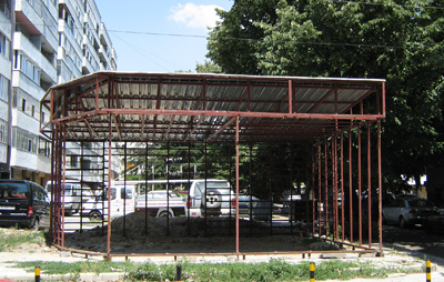Преди няколко месеца на ъгъла на улица „Братя Георгиевич”№15 в близост до НГХНИ „К. Преславски“ в междублоково пространство се появи метална постройка, която има статут на временно преместваем обект. Липсват обаче обозначителни знаци за фирмата изпълнител, времето, през което ще продължи строежът и с каква цел се изгражда той.