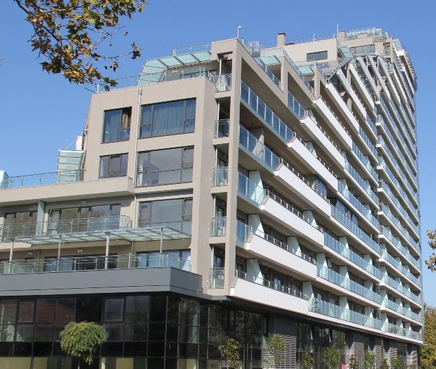 Всички фасадни елементи и детайли са изработени от неръждаема стомана. На вътрешната фасада са монтирани външни аварийни метални стълби. Поставени са специални 100% прозрачни ветрозащитни панели по високите етажи на северната фасада, както и елегантни слънцезащитни конструкции на откритите тераси. Декоративна дъга придава завършен вид на фасадата, съчетавайки уникалния обтекаем дизайн с функционалността.Подземен паркинг на три нива със 167 парко места, 7-метрова двулентова рампа и спринклерна инсталация за автоматично пожарогасене приютява автомобилите на многобройните обитатели и гости.