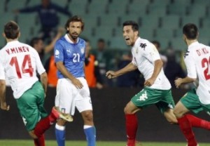Българският национален отбор изигра най-силния си мач от години насам и врътна домакинско равенство 2:2 с Италия на старта на световните квалификации. Срещата бе от група “В” и се игра на стадион “Васил Левски”, а нашите тотално надиграха “Скуадра Адзура” и може да се каже, че заслужаваха да стигнат и до победата. Попаденията за домакините бяха дело на Станислав Манолев и Георги Миланов в 30-ата и 66-ата минути, а гостите вкараха два гола от нищото, дело на Освалдо в 36-ата и 39-ата минути. Благодарение на равенството нашите успяха да спечелят първата си точка в цикъла световни квалификации за Мондиал 2014. Срещата започна много силно за нашите момчета и те още през първите няколко минути демонстрираха, че изобщо няма да се съобразяват с противника и ще търсят попадение. Още в 3-ата минута Станислав Манолев се озова в наказателното поле, но бе добре блокиран и нямаше какво да направи, за да застраши противниковата врата. Само пет минути по-късно Ивелин Попов бе изведен на добра позиция, но ударът му бе блокиран. Натискът на нашите продължи и след няколко минути Станислав Манолев пробва удар от 25 метра, който обаче срещна тялото на Анжело Огбоня. В 10-ата минута Попов центрира остро в наказателното поле на гостите, но нямаше кой да засече топката във вратата на Буфон. Нашите демонстрираха страхотна игра през първите минути и в 17-ата минута Влади Гаджев отправи първия точен шут от началото на мача, който бе в наша полза.В 24-ата минута пък нашите стигнаха до най-чистото си положение, след като Иванов стреля с глава, но топката премина край страничната греда. В 30-ата минута нашите стигнаха до попадение, след като Станислав Манолев със страхотен удар от около 30 метра матира Джиджи Буфон. Последваха отново добри минути за нашите, но гостите успяха да вкарат гол от нищото в 36-ата минута, след като Освалдо бе намерен непокрит на 7-8 метра от нашата врата и без проблеми реализира от близка дистанция.