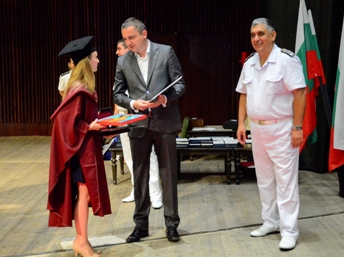 Ivan-Portnih88899.jpgКметът на Община Варна Иван Портних награди днес първенеца на цивилния профил на випуск 2015 на Висшето военноморско училище „Никола Йонков Вапцаров“ – Мария Ненова. Студентката, която завършва с отличен специалността „Мениджмънт на водния транспорт“, получи поименна грамота и парична награда. „Скъпи студенти, вярвам, че оттук нататък Виe ще продължите да се развивате професионално все така амбициозно и упорито, а Вашите успехи ще затвърдят името на Морско училище като елитно учебно заведение, което осигурява конкурентни кадри на световния пазар на труда! Бъдете дръзки и смели, отстоявайте мечтите си и все така радвайте своите близки! Носете Варна винаги в сърцето си, останете завинаги Вапцаровци“, обърна се към абсолвентите кметът Иван Портних. „Използвам случая да благодаря на академичния състав на ВВМУ и специално на кап. първи ранг проф. Боян Медникаров за амбицията, с която се поддържа високото професионално ниво на преподавателския състав на нашата Морска Алма Матер!, заяви в поздравителното си слово кметът. Тържествената церемония се проведе в зала 1 на Фестивалния и конгресен център, където над 200 студента получиха своите бакалавърски дипломи. Промоцията на випуска уважиха зам.-министърът на отбраната – доц. д-р Орхан Исмаилов, областният управител на Варна Стоян Пасев, командирът на Военноморските сили на Република България –контраадмирал Митко Петев, представители на Морска администрация и др.