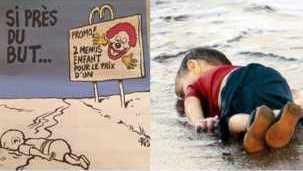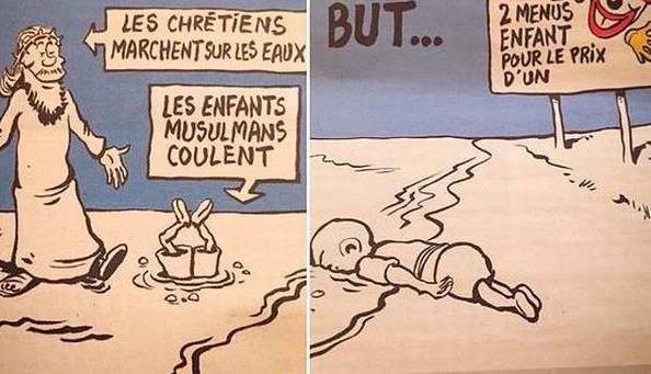 В последното си издание Charlie Hebdo обаче подхожда провокативно със серия шаржове, на които е изобразен Айлан, който лежи по лице в пясъка, а над него има надпис, гласящ „Толкова близо до целта”, и рекламна табела на McDonald’s, на която пише: „Две детски менюта на цената на едно.” В друга карикатура от броя, изобразяваща смъртта на момчето, може да бъде прочетено: „Християните ходят по вода, а децата на мюсюлманите потъват.” Рисунката е озаглавена: „Доказателството, че Европа е християнска.”