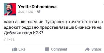 post-ivetИкономистът и съветник на икономическия министър Лукарски, Владимир Каролев публикува любопитен пост на журналистката Ивет Добромирова: „Приятел на Радан Кънев ми изпрати току-що пост на журналистката-ПР експерт Ивет Добромирова, в който тя твърди, че Божидар Лукарски бил редовно защитавал като адвокат „бизнесите на Дебелия пред КЗК“. Понеже много дебели има в България, ако г-жа Добромирова има предвид Делян Пеевски, то тя лъже. Ако има предвид някой друг дебел, да каже кой е. Ако има предвид Пеевски, ще я чакам в съда, за да докаже дали не съм прав, като я наричам лъжкиня или тя наистина е такава. И после да не се чудят защо много българи въздъхват с погнуса от политиката, казвайки, че каквито са едните, такива са и другите. P.S. Разбира се Радан Кънев няма вина, че негов фен разпространява лъжа.“