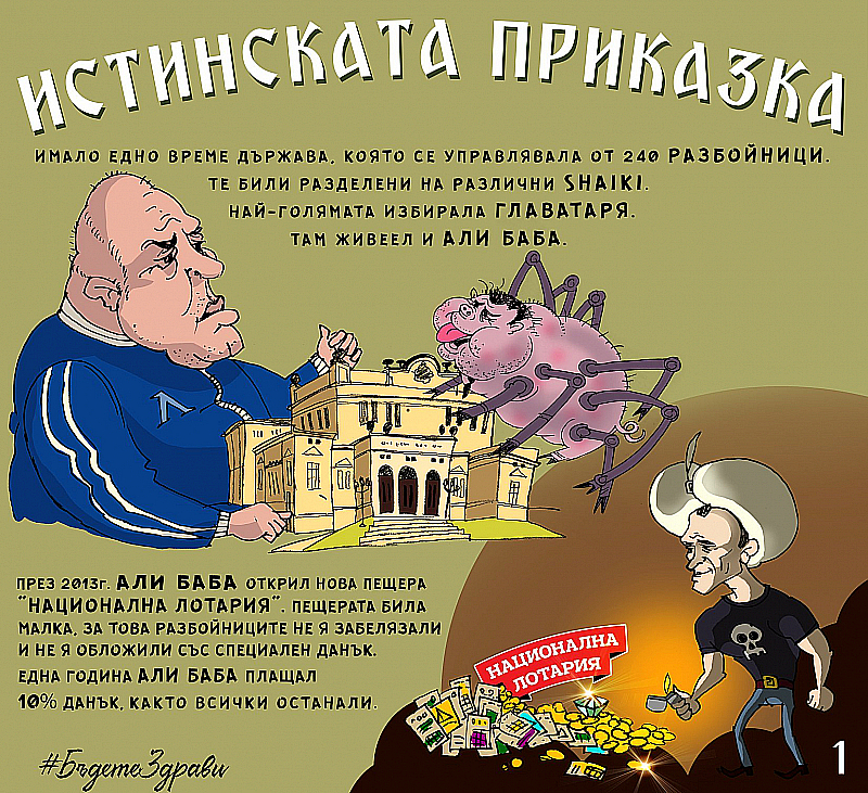 Божков се има за добрия герой в приказката, представя сам себе си като Али Баба, а разбойниците са – Борисов, Горанов и Менда Стоянова.