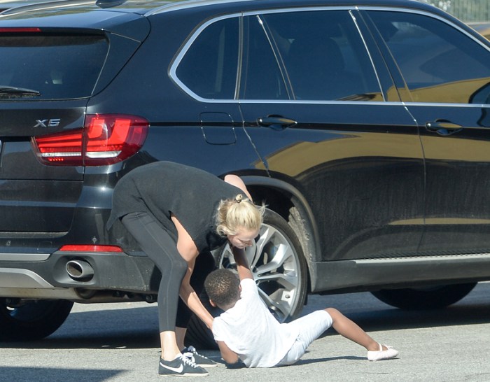 Малчуганът се тръшка и по някаква причина отказва да влезе в колата, заедно с майка си и новородената си сестричка. Чарлийз от своя страна изглежда е загубила търпение, тъй като буквално го влачи по асфалта.
