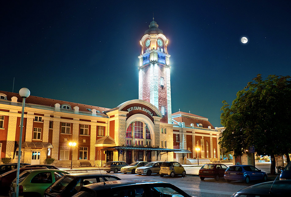 ЖП гара Варна е една от централните гари в страната ни, от която тръгват влакове по всички направления. Сградата на варненската гара е била една от първите построени станции в България, тъй като от гр.Варна е тръгвала и първата жп линия в България: Варна-Русе, която е била открита на 26 октомври 1866г.Гарата е строена върху площ от 2100 кв.м. Ако се чудите защо ЖП гарите във Варна и Бургас си приличат толкова много , отговорът е Никола Костов- Проектирал и двете гари. Първи камък е положен на 11 юли 1907 година, но скоро заради войните стройтелството е спряно. Подновено е чак през 1920 г. Открита е на 03 март 1925 година, като 14 години по-късно се построяват навесите на пероните и чак през 1952 гарата е завършена и вътрешно. Часовникът на гарата е поставен там през 1929 година.Между 1883г. и 1885г. през ЖП гара Варна е минавал и известният “Ориент Експрес”.