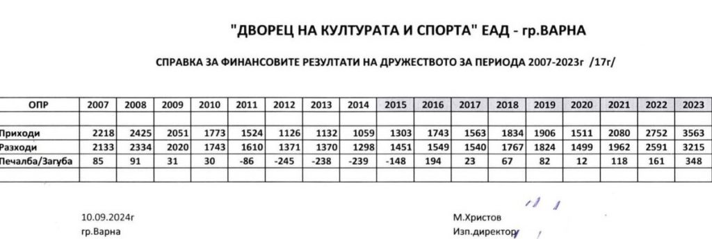 Припомням в какво състояние се намираше „ДКС“ през 2014г, когато постъпих на работа като Изпълнителен директор. За 2012г- загубата е в размер на 245х.лв; За 2013г- загубата е в размер на 238х.лв; За 2014г-загубата е в размер на 239х.лв; Представям Ви справка от която е видно тренда на растеж на печалбата на Двореца през последните години: