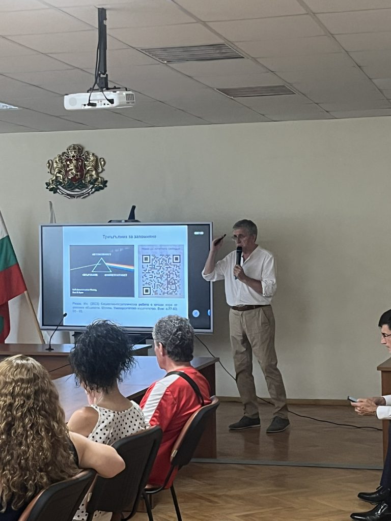 На срещата присъстваха директори и учители от всички основни и средни училища в общината.Проф. Ризов говори на тема „Играещото училище – завръщане в бъдещето“. В своята презентация той изтъкна решаващата роля на играта в обучителния процес и сподели линкове към литература, която би била полезна в работата на учителите.