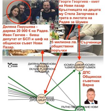 Изданието допълва, че Диляна Парушева живее на семейни начала с Иван Ганчев, и двамата видимо са в много близки отношения с кмета Георги Георгиев, празнуват Нова година в дома му на видно място на трапезата. А кръстницата на децата на новопазарския кмет е трета в листите на Радев.