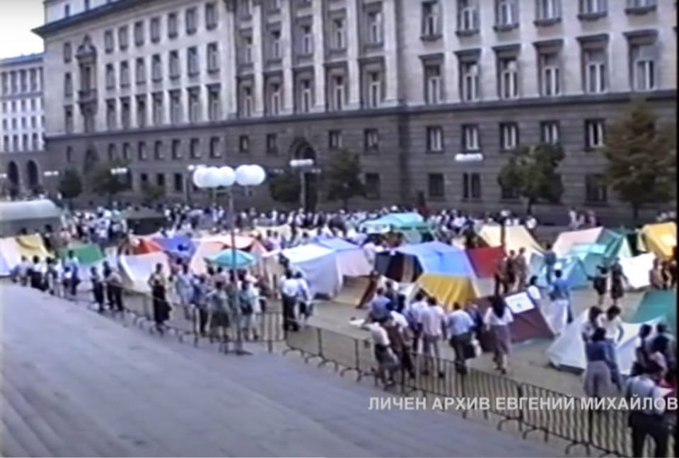 Режисьорът Евгени Михайлов публикува снимка от протестите през 1990 г. и снимка от днешните протести и написа във фейсбук профила си: Палатковият ви град е ерзац! През юли 1990 сваляхме Президент лъжец! През юли 2020 браните Президент, който излъга, че не е бил член на БКП, но размаха комунистическия си юмрук. Браните и разследваните му съветници – ченгета!